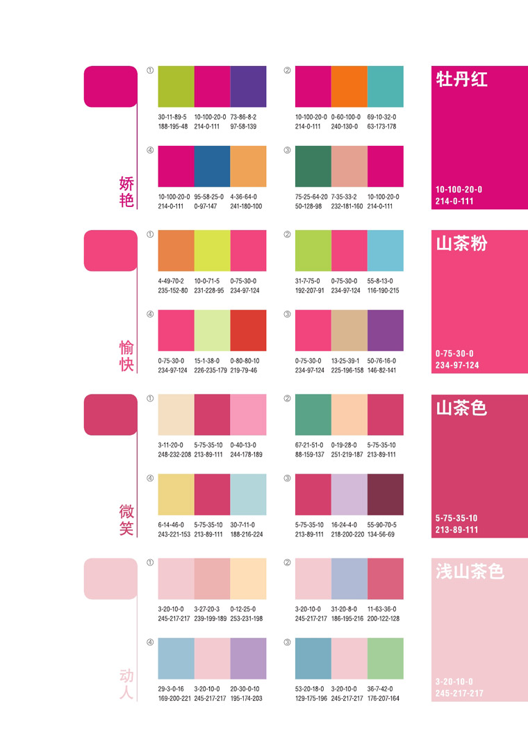 代表娇艳、愉快、微笑、动人的红色系配色方案:牡丹红、山茶粉、山茶色、浅山茶色