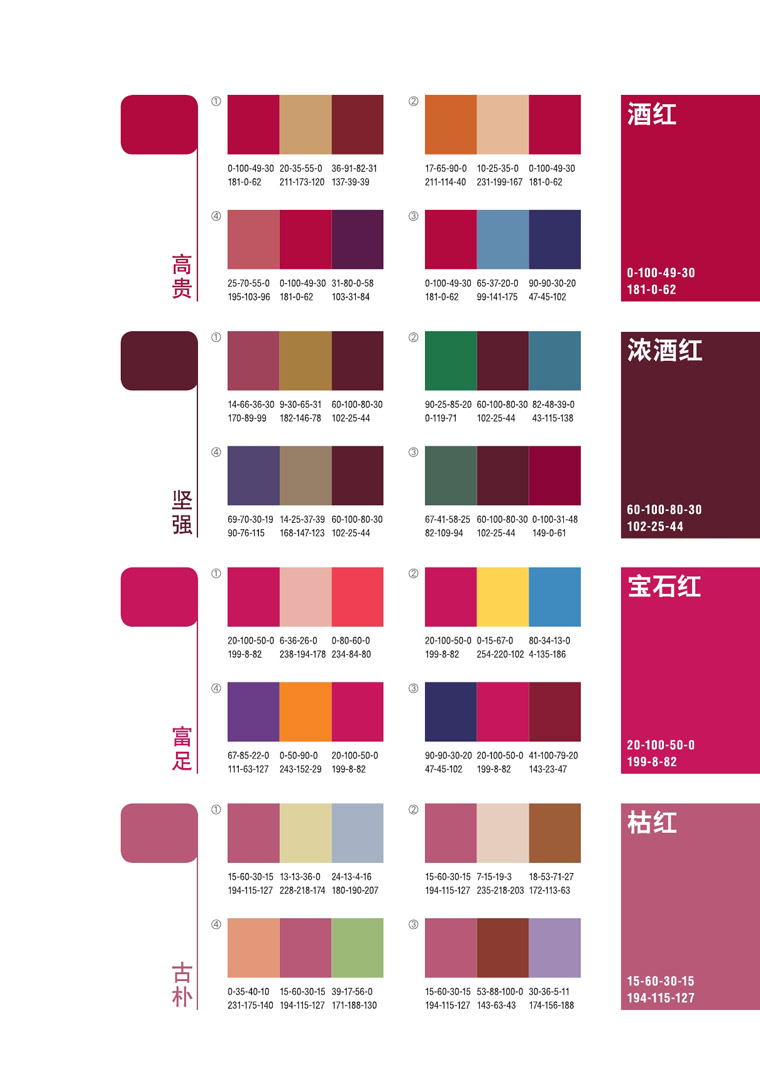 代表高贵、坚强、富足、古朴的红色系配色方案:酒红、浓酒红、宝石红、枯红
